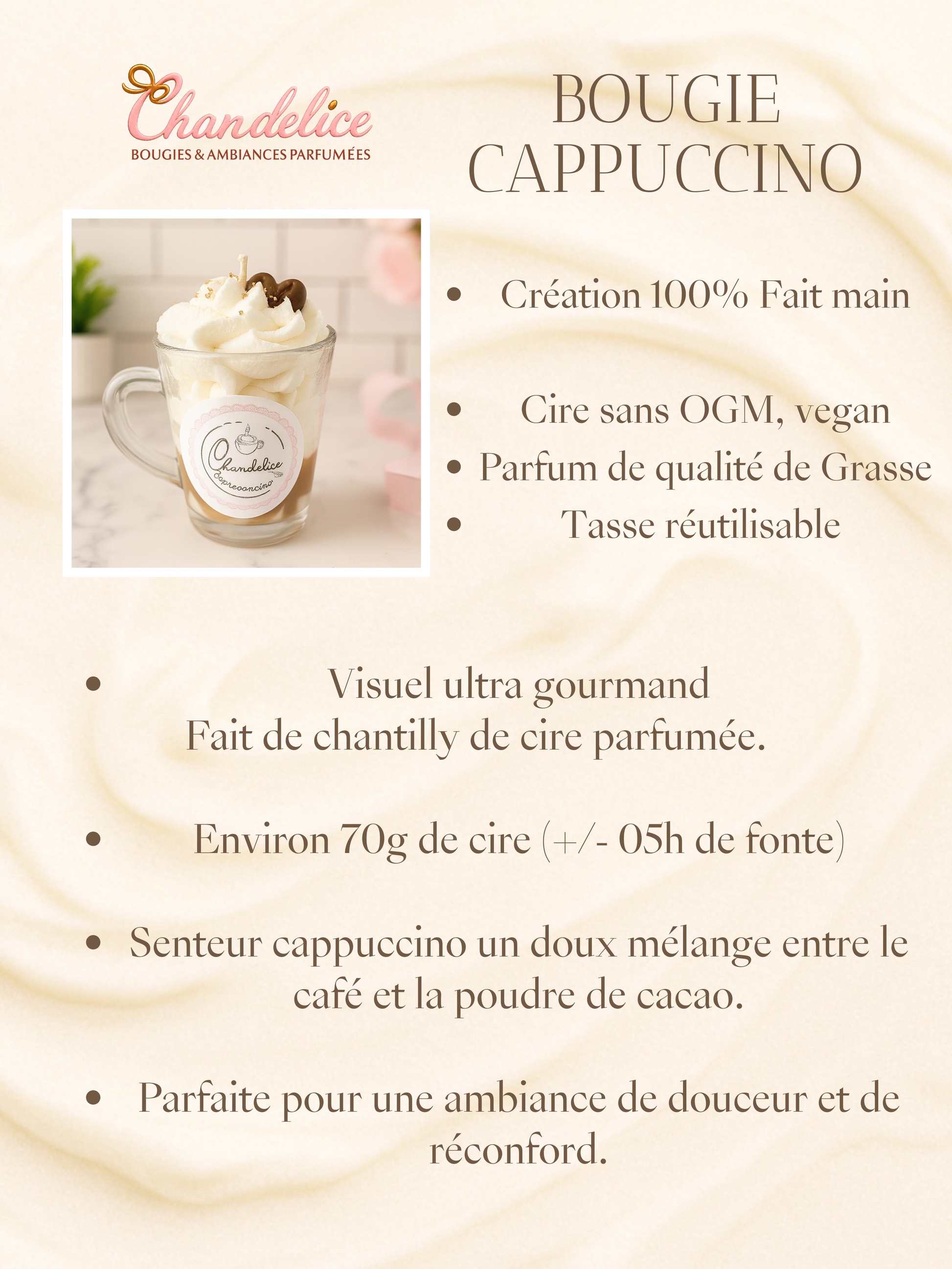 Savourez l’odeur réconfortante d’un cappuccino tout juste préparé avec cette bougie gourmande, aussi belle qu’appétissante. Coulée dans sa tasse en verre réutilisable, elle révèle de généreux tourbillons de chantilly de cire parfumée réalisés à la main, nappés d’un coulis façon coffee shop et parsemés de petits grains de café.