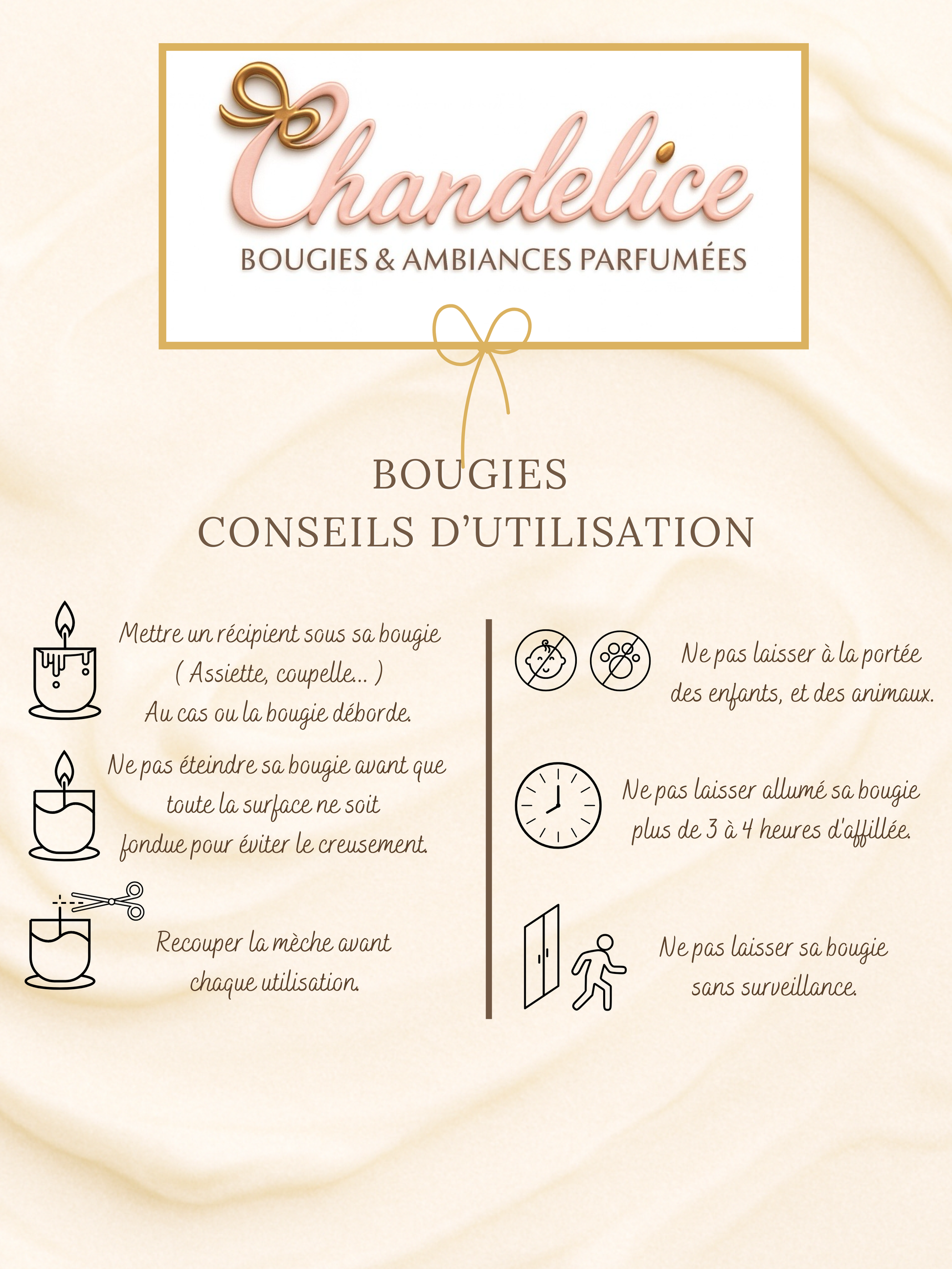 - Lors du premier allumage laisser fondre la cire jusqu'à ce qu'elle soit fondue sur toute la surface du verre, afin d'éviter à votre bougie de se creuser par la suite.